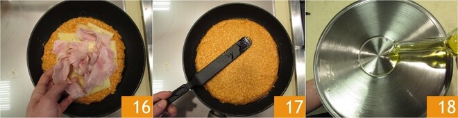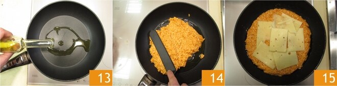 Ahora, en una sartén de diámetro de base 22 cm y diámetro en superficie 28 cm, antiadherente, vierte un chorrito de aceite 13 y comienza a colocar aproximadamente la mitad del arroz en la sartén, aplánalo con la ayuda de una espátula para que esté bien distribuido en el fondo de la sartén 14. Ahora coloca la fontina en el centro del arroz 15