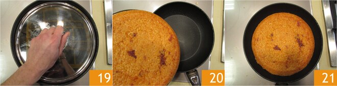 y el jamón cocido 16. Cubre con el arroz restante de manera uniforme 17. Enciende el fuego y dora tu tarta durante unos 7 minutos. Unta ligeramente un tapadera que te servirá para voltear la tarta 18.