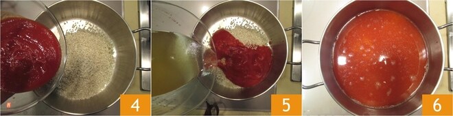 añade una pizca de sal, la salsa de tomate 4, el caldo 5, lleva al fuego y comienza la cocción 6. Remueve a menudo y cocina durante unos 17 minutos (los tiempos pueden variar según la calidad del arroz, un carnaroli cocina en 15-18 minutos).