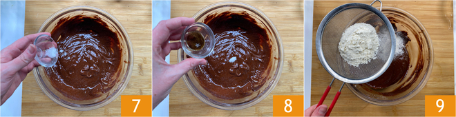 Añade también la sal 7 y el extracto de vainilla 8. Tamiza la harina en un bol 9.