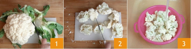 Para realizar el pastel de coliflor y achicoria, limpia la coliflor eliminando las hojas verdes 1 y el tallo central, y siempre con la ayuda de un cuchillo de hoja lisa, separa todos los ramilletes, dividiendo por la mitad los más grandes 2. Transfiere los ramilletes limpios a un colador y enjuágalos bajo el agua fría 3.