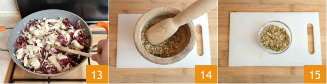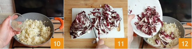 y de pimienta 10, mezcla y deja que se aromatice todo durante 5-6 minutos. Mientras tanto, limpia la achicoria eliminando el tallo central, córtala finamente 11 y añádela a la sartén con la coliflor 12, mezcla, deja saltear unos segundos para que no se marchite demasiado