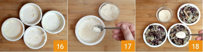 Precalienta el horno a 200°C en modo estático. Unta con mantequilla 4 cazuelas de un diámetro de aproximadamente 11 cm 16 luego espolvorea el interior con pan rallado 17. Llena cada cazuela con la coliflor y la achicoria, añade en la superficie una pizca de pan rallado 18