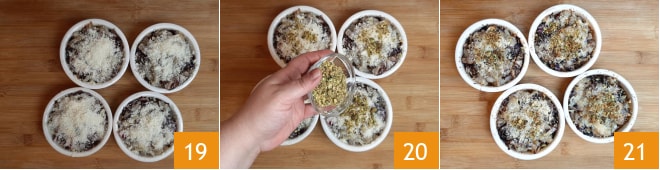 y una cucharadita de Grana Padano rallado 19. Termina con el granillo de pistacho 20 y hornea durante unos 15 minutos, gratinando los últimos minutos de cocción con el grill para dorar la superficie. Saca del horno las cazuelas de coliflor y achicoria con pistachos, y sírvelas calientes 21.