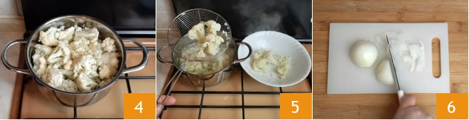Pon una cacerola llena de agua al fuego y, cuando hierva, sumerge los ramilletes de coliflor 4 cociéndolos durante unos 10 minutos; la consistencia deberá quedar bastante al dente, ya que se salteará en la sartén, continuando luego la cocción en el horno. Escurre la coliflor en un bol y déjala a un lado 5. Limpia la cebolla y córtala finamente 6.