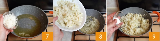 Calienta un poco de aceite en una sartén, añade la cebolla 7 y sofríe a fuego lento en una sartén amplia. Cuando la cebolla esté dorada, añade la coliflor 8, ajusta de sal 9