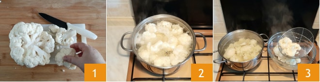 Para preparar el pastel de coliflor, eliminad las hojas externas y el tronco central, después separad delicadamente las flores ayudándoos con un cuchillo pequeño. Coced las flores en agua hirviendo 2. Después de 20 minutos estarán blandas, lo notaréis con las púas de un tenedor. Escurridlas y aplastadlas aún calientes 3.