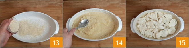 Engrasad con mantequilla una fuente de horno y espolvoread el interior con pan rallado 13. Verted la mitad del puré de coliflor y patatas en el fondo de la fuente y nivelad con el dorso de la cuchara 14, luego cubrid la superficie con parte de la mozzarella 15.