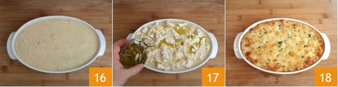 Comenzad de nuevo vertiendo la parte restante del puré 16, siempre nivelando, y terminad con la otra mozzarella restante. Espolvoread con pan rallado, verted un chorrito de aceite y podéis pasar a la cocción 17. Hornead el pastel de coliflor a 200° durante unos 25 minutos en un horno estático precalentado. Un breve gratinado al final de la cocción para dorar la superficie y finalmente podréis disfrutarlo: servidlo con un toque de perejil 18.