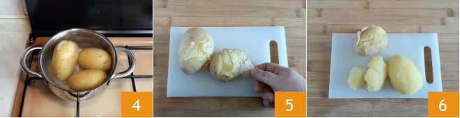 Mientras tanto, coced también las patatas, colocándolas en una olla grande llena de agua 4. Llevad a ebullición y coced de 30 a 50 minutos según su tamaño. Una vez listas (haced siempre la prueba con el tenedor), peladlas cuando aún estén muy calientes 5: de esta manera, la piel se quitará fácilmente 6.