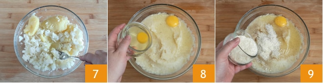 Aplástalas también en el bol con las coliflores y obtened un puré muy suave 7. Ahora podéis añadir los huevos 9, ajustad de sal y pimienta, verted el queso rallado 9,