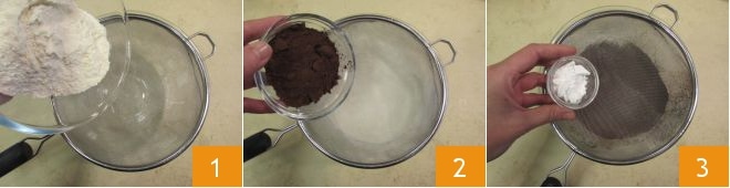 Para preparar el pastel de jengibre en molde bundt, primero derrite el chocolate negro en el microondas o al baño maría, luego déjalo entibiar. En un tazón grande tamiza la harina 1, el cacao 2 y la levadura.