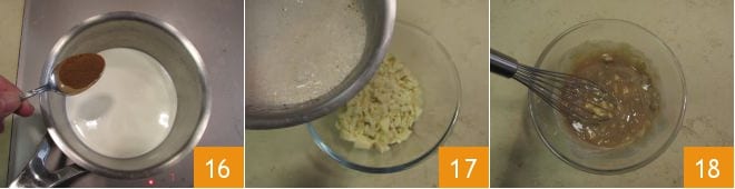 En un cazo calienta la nata con una cucharadita de canela 16 y luego viértela bien caliente sobre el chocolate blanco picado 17, mezcla con una varilla para derretir el chocolate 18 y obtener una salsa lisa y homogénea.