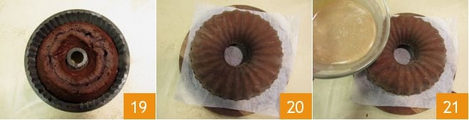 Mientras tanto, el roscón estará cocido, sácalo del horno 19, déjalo enfriar, luego desmóldalo sobre una tabla cubierta con papel de horno o una bandeja 20. Vierte la cobertura de chocolate blanco sobre el pastel 21.