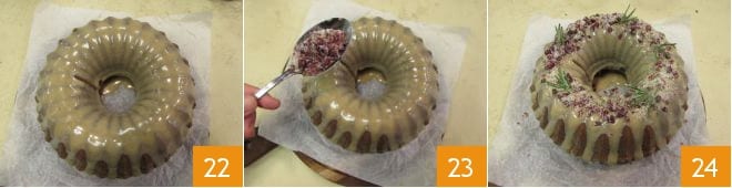 Debes cubrir la superficie 22, adorna inmediatamente con los arándanos azucarados 23. El pastel de jengibre en molde bundt está listo para ser degustado 24.