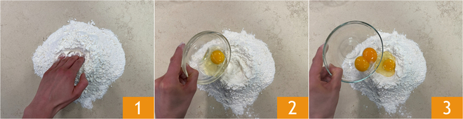 Para preparar la tarta de la abuela, lo primero que hay que hacer es comenzar con la masa. Coloca la harina sobre una superficie de trabajo y forma la clásica fuente 1. En el centro coloca el huevo 2 y las yemas 3.