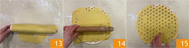Enrolla la masa en el rodillo 13 y colócala sobre el molde para rombos bien enharinado. Pasa el rodillo por encima presionando suavemente 14. Luego elimina los rombos de masa, en medio de las losanges, presionando con el dedo y con un cuchillo corta los bordes sobrantes para obtener tu decoración 15. Si no tienes este molde, también puedes hacer las tiras a mano.