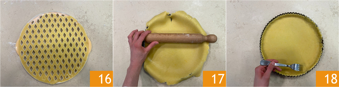 En este punto, ponla en el congelador 16 y amasa rápidamente los restos de masa, que servirán para la decoración. Mientras tanto, extiende la masa restante hasta obtener un disco de medio cm de grosor y con la ayuda de un rodillo, transfiere la masa dentro de un molde para tartas de 26 cm 17, mejor si es con fondo desmontable. Haz que la masa se adhiera bien a los bordes y elimina el exceso con un cuchillo. Amasa la masa junto con los restos de antes. Pincha el fondo de la tarta con las púas de un tenedor 18; este paso evitará que se infle durante la cocción.