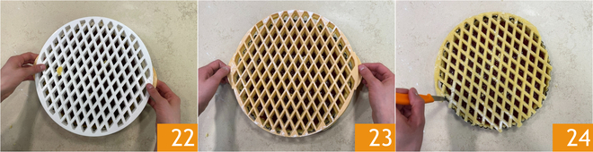Retira el molde de los rombos del congelador y despega tu rejilla de masa 22, colócala sobre la tarta, presionando suavemente 23 y elimina el exceso de masa con un cuchillo 24. Puedes utilizarla para hacer más galletitas para la decoración.