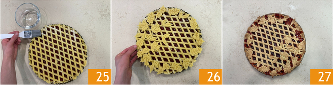 Pincela los bordes de la tarta con un poco de agua 25 y coloca encima las galletitas 26; de esta manera no se despegarán durante la cocción. Puedes decorar la tarta colocándolas en los extremos de cada tira o donde prefieras 26. Precalienta el horno a 180° en modo estático, hornea la tarta en la rejilla central durante unos 40-50 minutos. Si las tiras se doran demasiado, cubre la superficie con un papel de aluminio. Saca del horno y deja enfriar completamente antes de desmoldar y servir tu tarta 27.