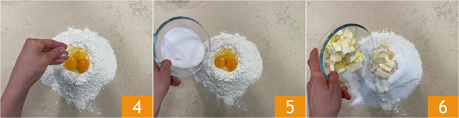 Añade una pizca de sal 4 y esparce el azúcar sobre la harina 5. Luego, añade también la mantequilla fría cortada en trozos pequeños 6.