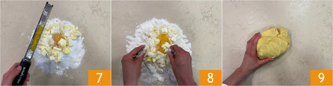 Por último, añade la ralladura de limón 7. Comienza a amasar con la punta de los dedos 8, rápidamente, desde afuera hacia adentro. Amasa hasta obtener una masa suave 9.