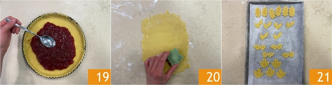 Vierte la mermelada dentro del molde y nivélala con el dorso de una cuchara 20. Con pequeños moldes, de aproximadamente 2 cm de diámetro, recorta galletitas de la masa sobrante 19 y colócalas poco a poco en una bandeja con papel de horno 21. Puedes hacer las formas que prefieras.
