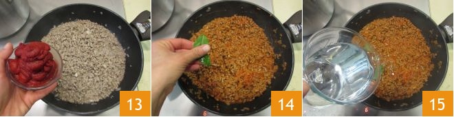 Incorpora ahora el concentrado de tomate 13. Mezcla todo, añade el laurel 14 y alarga con el agua 15.