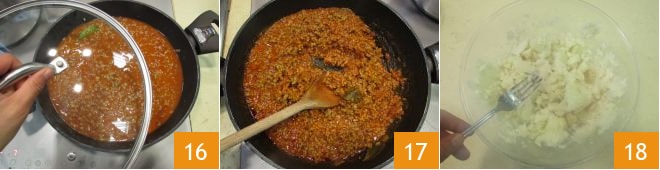 Cubre con la tapa y cocina a fuego lento durante al menos una hora, ajustando de sal al final 16. Una vez que el ragú esté listo 17 procede desmenuzando la coliflor con el tenedor 18.