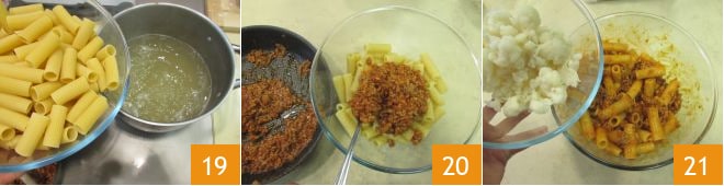 Cuece la pasta 19, asegurándote de escurrirla al dente. Condimenta la pasta con el ragú 20 y la coliflor 21.