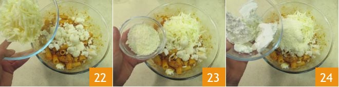 Sazona con el caciocavallo rallado 22, el pecorino rallado 23 y la ricotta 24.