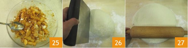 Mezcla bien todo 25 y reserva. Retoma la masa y aparta una pequeña bola de masa para poder realizar la cobertura 26. Extiende el resto de la masa con el rodillo 27.