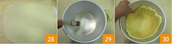 Debe alcanzar un espesor de aproximadamente un centímetro y medio 28. Toma un molde con forma de tronco de cono que mida 16 cm en la base, 22 cm en la parte superior y con un borde de 12 cm de altura. Unta con aceite hasta un poco más de la mitad de la profundidad del mismo 29. Forra el interior con la lámina de masa 30 haciéndola adherirse bien al fondo y al borde.