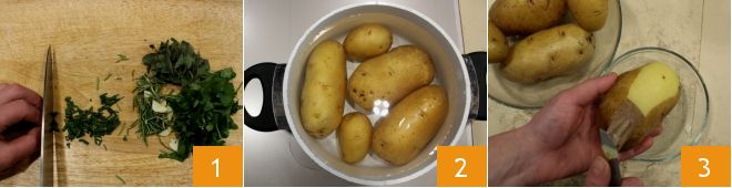 Para preparar el pastel de patatas, comienza picando finamente las hierbas aromáticas y el diente de ajo pelado 1. Luego lava las patatas bajo agua corriente, frotando con las manos para quitar la tierra. Pon a cocer las patatas en una cacerola 2 durante unos 20 minutos o hasta que puedas pincharlas con las puntas de un tenedor. Cuando estén listas escúrrelas y pélalas con un cuchillo 3: para no quemarte, puedes ayudarte con papel de cocina.