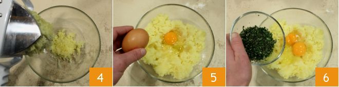 Luego aplasta las patatas con el prensapatatas y recógelas en un bol 4. Añade a las patatas los huevos 5, todas las hierbas que habías picado previamente 6,