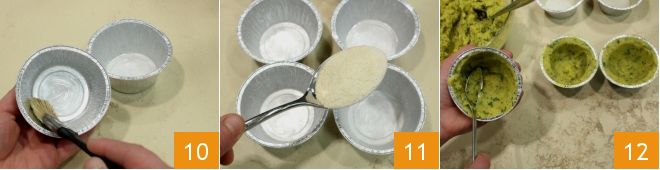 Después, toma 7 moldes (puedes usar los de aluminio desechables) con una capacidad de 125 ml cada uno, úntalos con mantequilla ayudándote con un pincel de cocina 10. Espolvoréalos con pan rallado 11. Ahora puedes comenzar a llenar los moldes para formar el pastel: con una cucharilla vierte poco a poco la mezcla de patatas y con el dorso de la cucharilla hazla adherirse al fondo y al borde 12.