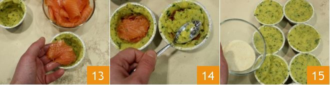 Deja espacio en el centro para rellenarlo con 2-3 rodajas de salmón 13. Luego cubre con más mezcla de patatas 14 y nivela la superficie del pastel. Para terminar, espolvorea con pan rallado 15 y