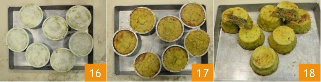 rocía cada pastel con un hilo de aceite de oliva 16. Hornea en horno estático precalentado durante 40 minutos a 180° (35 minutos a 160° para cocción en horno ventilado). Cuando estén cocidos y bien dorados en la superficie 17, deja que los pasteles se entibien y luego desmóldalos volteándolos 18. Así tendrás tu pastel de patatas con un delicioso corazón de salmón para servir como entrante o como guarnición deliciosa!