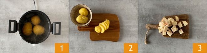 Para preparar el pastel de patatas, speck y taleggio, hierve las patatas en abundante agua 1, escúrrelas y pélalas aún calientes. Córtalas en rodajas de aproximadamente medio centímetro de grosor 2. Corta también el taleggio en rodajas y luego en trozos 3.