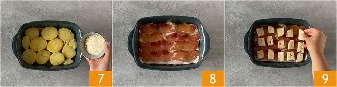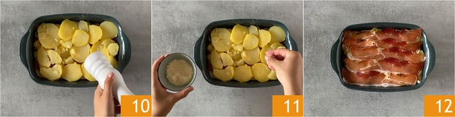 Continúa con otra capa de patatas, salpimenta, sazona con el Grana Padano 11, el speck 12 y nuevamente el taleggio.