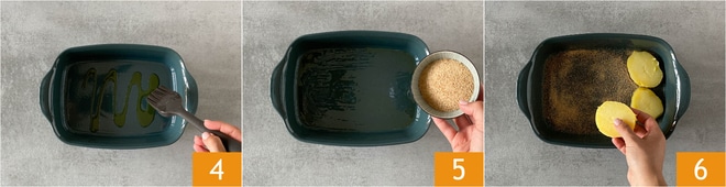 Unta el fondo de una fuente de horno de 30x20 cm 4, luego espolvorea con pan rallado 5. Coloca las rodajas de patata formando una capa compacta 6.