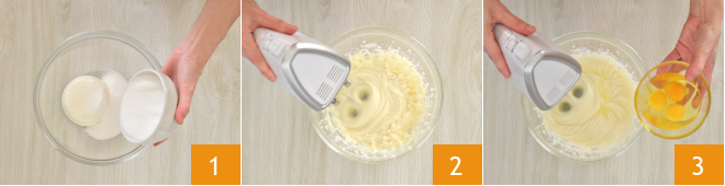 Para preparar el plumcake integral, comienza con la masa. Toma la ricotta y colócala en un bol junto con el azúcar granulada 1, comienza a batir con una batidora hasta obtener una crema homogénea 2, luego añade los huevos uno a uno 3.