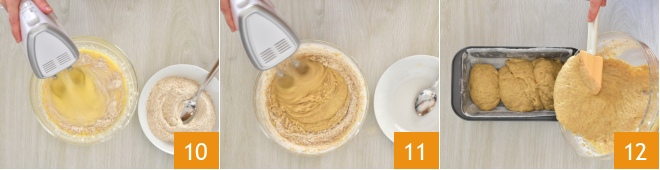 Trabaja aún con las varillas eléctricas y, manteniéndolas en acción, comienza a añadir la harina integral poco a poco 10 11. Trabaja durante un par de minutos, hasta obtener una masa homogénea. Vierte la masa en un molde para plumcake forrado con papel de horno de 14x24 cm 12.