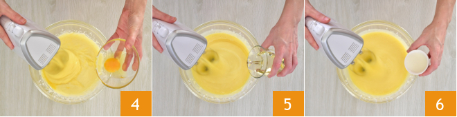 Espera que estén bien incorporados antes de añadir el siguiente 4. Siempre con las varillas en acción, añade poco a poco el aceite de girasol 5 y la leche 6.