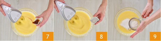 Agrega también el extracto de vainilla 7 y la pizca de sal 8 y continúa batiendo durante aproximadamente 1 minuto. Añade la levadura en polvo tamizándola 9 para eliminar posibles grumos.