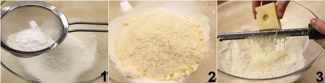 Para preparar el pastel salado, comienza tamizando en un bol la harina y la levadura 1, añade después el Grana Padano rallado finamente 2. Mezcla bien los ingredientes e incorpora el leerdammer rallado 3.