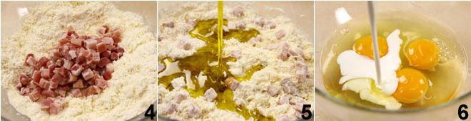 y la panceta ahumada en cubos 4, mezcla todo. Luego añade el aceite de oliva virgen extra en hilo 5. En otro bol, bate los huevos con la nata y la leche 6,