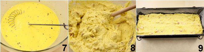salpimenta 7 y añade el líquido así obtenido a la mezcla de harina, quesos y panceta. Mezcla con una cuchara de madera hasta que los ingredientes estén bien integrados 8. Unta con mantequilla y harina un molde de pastel con capacidad de un litro y coloca la mezcla. Nivélala con el dorso de una cuchara 9 y hornea en horno precalentado a 180°C durante 45/50 minutos, haciendo la prueba del palillo para comprobar la cocción. Cuando el pastel salado esté cocido, espera a que se temple antes de desmoldarlo, luego déjalo enfriar completamente sobre una rejilla. ¡Sirve tu pastel salado en rodajas!