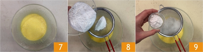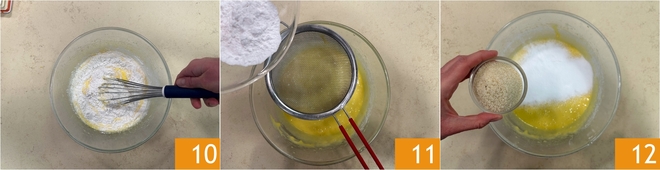 Mezcla con una varilla a mano de abajo hacia arriba con movimientos lentos y precisos 10. Añade también la fécula de patata tamizada 11 y la harina de almendra 12.