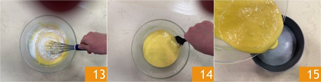 Mezcla con una varilla a mano 13 para incorporar completamente las harinas, hasta que obtengas una masa lisa y homogénea 14. Vierte la mezcla en un molde de 20 cm de diámetro forrado con papel de horno o bien engrasado y enharinado con harina de arroz 15.